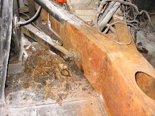 Rust, rust, rust. Now a lot of it is only surface rust, but thick surface rust if you get my drift. I wonder how much weight ;-) the frame has lost due to rust? Anyway it's toast as far as I'm concerned. Looking at it today I would not want to trust it and I have not seen the front or the bottom yet. More straw , leaves, years of solidified oil and grease. What a mess.