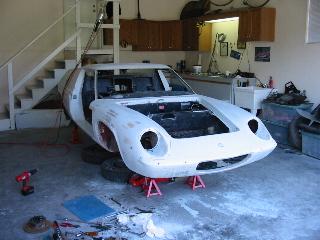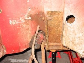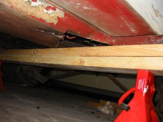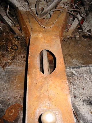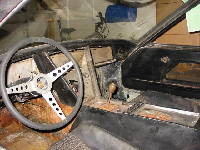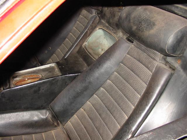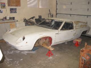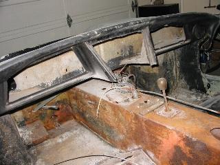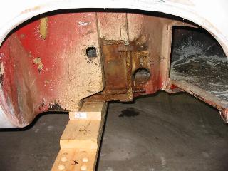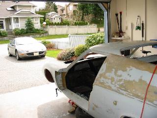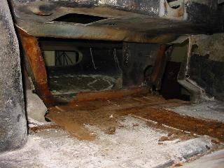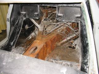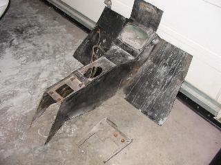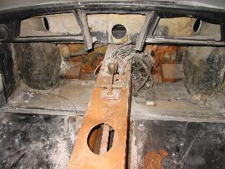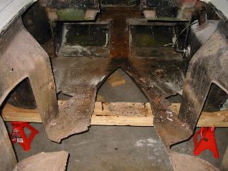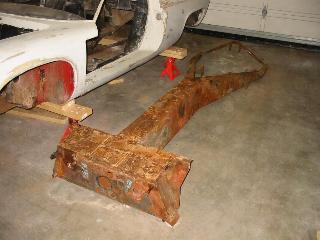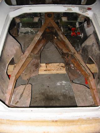At this point, the front of the frame was sitting where the rear bulkhead used to be, and the Y of the frame was angled out the rear pointing at the sky. And it stuck there. I couldn't squeeze the front T section past the rear wheelwells. Hmmm. So, I climbed inside the engine area and stood beside the frame and slowly turned it on it's edge, so it was sort of perpendicular to the car. Finally picked it up and levered it out the back. What a trip. Did a little dance listening to Santana, then sat down to give my nerves a rest. Yup, the frame is trash. As I expected. Now what?