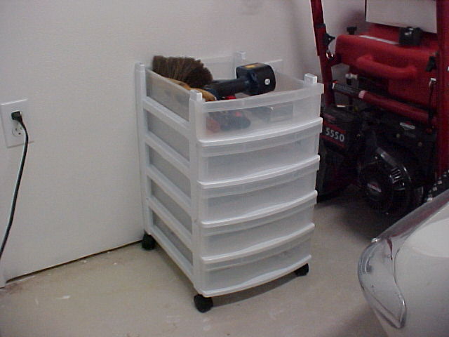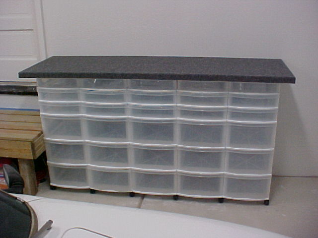 Picked up 5 plastic storage modules from Sam's Club today. Each has 7 drawers and is almost 40" high. Also picked up a 12" x 72" and a 10" x 72" shelf from Home Depot. Will screw all modules together and attach the shelves to the top to create a workbench with 35 storage drawers.