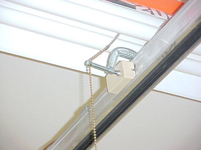 Hung one of the light fixtures today. Need to go to Home Depot to buy some pull-chain extensions, as the ones provided are too short. When all fixtures are centered, the chain on the one over the opener will interfere with the screw drive. Will fabricate a bracket to hold the chain a few inches to the right of the screw drive.