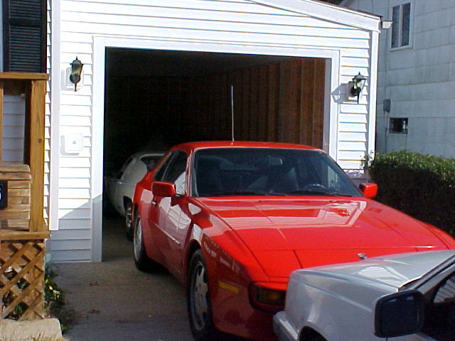 Worked on the new garage from 7:00 AM to 5:00 PM today. Put up the third wall, installed the rear door, and put siding on the two walls that face the street. The outside of the garage is pretty much finished. I still need to install the overhead door, put siding on the back wall and replace the rain gutter, but at least the europa has a home.