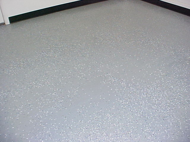 This morning the temperature outside was 80°F and inside the garage was 72°F so I painted the garage floor. Mixed the provided citric acid with water then wet the entire floor, spread the acid and brushed it in with a push broom. Rinsed several times to remove any residue then blew the floor dry with my leaf blower. Took from 8:00 AM to 9:15 AM to prepare the floor. Mixed one gallon of EpoxyShield parts "A" and "B" and let it sit for 10 minutes while I masked the bottom of the doorframes. Brushed the mixture on around the doors and corners then rolled it in about 4' x 4' squares so I could toss the accent chips onto the wet paint. Completed painting the entire floor by about 10:30 AM. Surprised that it only required one gallon of the paint to cover the 12' x 24' floor. Used most of two packages of accent chips so if I ever find a use for the remaining gallon of EpoxyShield, I'll have to get more accent chips. The floor must dry for 24 hours before light foot traffic and 7 days before I can move the Europa back inside. While I'm waiting for the floor to fully cure, I'll install the cove base.