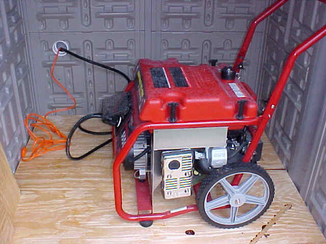 Bought a 5.5'W x 6'D by 6'H Rubbermaid Roughneck vinyl storage shed at Sam's Club today. I will assemble it outside the rear wall of the garage, store the generator in it, and route the generator cable between the two. When power fails I'll start the generator and flip the switches on the disconnect panel in the garage. Here's a Rubbermaid photo.