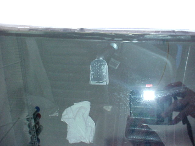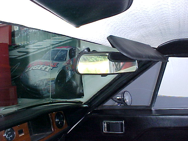 There is some interest on the lotuseuropa list in photos of the Wal-Mart day/night mirror I installed on my windshield. For those of you who asked for photos, here is one of the mounting foot from outside and one of the mirror on the inside. The drooping visor is soon to be replaced and I have pulled the outside windshield trim for replacement.