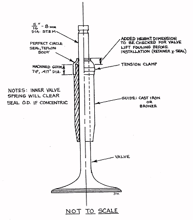 To install, major work is necessary, including machine shop time. The old guides must come out and most likely will be ruined. Bronze or cast iron standard ENFO guides must be machined from 0.500" OD to 0.417" to a depth suitable to accept the body of the seal and its metal spring clamp. The guides are then installed without seals, seats reground, and, finally, seals pressed on from the top. These seals have been used with cam lift of up to 0.400". At this lift, retainer to seal clearance gets very small, however.