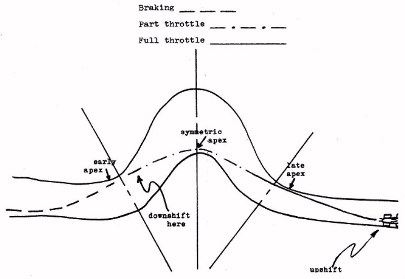 We will have novice classes for those who have never slalomed before, and it is for you novices that these notes are primarily directed. Novice or expert, there are some basic driving principles we must review from time to time. You must always remember that a locked or spinning wheel cannot turn the car. What this means in slaloming is that all your braking must be done before getting to a turn and all accelerating should be done in as straight a line as possible. It also makes sense that leaving a turn with an extra 5 mph, which carries you down the straight quicker is worth more than the extra 10 mph deep in the turn which botches your exit from the turn and causes you to be slower on the straight. Here are the three types of turns and the proper driving techniques for them: