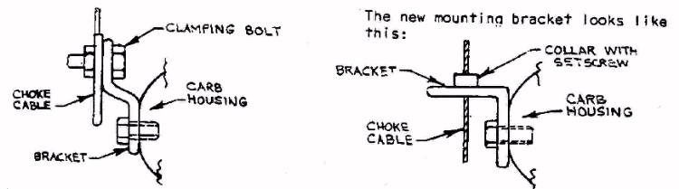 The collar with set screw is the type the model airplane people use to hold wheels on axles. They cost about 75¢ for four (and the Allen wrench comes free) and they come in several sizes, Bring the choke cable into a hobby shop and try all the sizes for the best fit, The brand I bought is Dura-Collar by Du-Bro. The bracket is made out of a piece of thin wall square tubing angle iron, or aluminum, or thick sheet metal and drilled to fit the carburetor mounting pin and bolt. Now the choke cable spins freely and doesn't twist and untwist each time the choke is used.