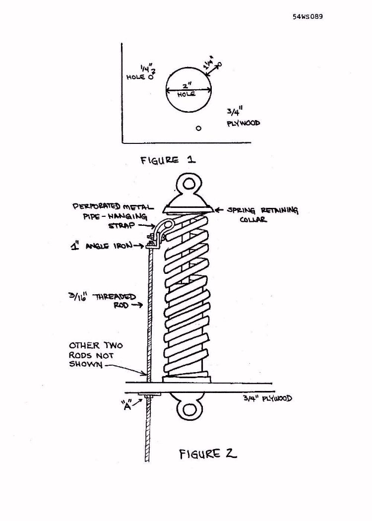 SPRING REMOVAL AND REFITTING - An easy, inexpensive and safe way to remove springs from shock absorbers is shown in Figures 1 and 2. Tightening up on the three nuts marked "A" (only one of which is shown in the diagram) compresses the spring, allowing the spring retaining collar to be removed. The "A" nuts are then loosened until the spring is fully extended, and, finally, removed to allow the spring (with the three rods still attached) to be removed from the shock. Position the new shock in the hole and reverse the foregoing procedure. One hint: When installing the springs on the new shock, be sure the upper and lower shock mounting 'eyelets' are parallel before releasing spring tension onto the re-positioned spring-retaining collar.