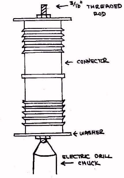 PREVENTING BOWING OF SPRING - The body of Koni shocks is smaller in diameter than the stock shock absorber, which itself has a diameter very close to the inside diameter of the coil spring. The narrower Koni body allows the spring to bow when it is compressed, which causes it to rub on one side of the body of the shock. This problem can be remedied by adding a 'sleeve' over the body of the Koni shock to increase its diameter to just under the inside diameter of the spring. There are undoubtedly a number of ways to do this; the following is what I came up with. At a hardware store look for the indoor household plastic plumbing pipe section, and, specifically, for the plastic connectors used to join two straight pieces of pipe. These are about 6 inches long and come in a variety of diameters. Take your Konis with you and select a connector with an inside diameter that will fit over the body of the shock absorber. I found that there were two such connectors: one a loose fit, and one a very tight fit (more on this, later). The outside of these connectors have a series of serrated rings around them, making them too large to fit inside the coil spring. However, they may be easily 'turned down' by using a hand-held electric drill as shown in Figure 3. Mount a coarse file or rasp in a vise.and grind away - the plastic is soft - until it slides easily inside the spring. (Note: In lieu of the top washer in Figure 3, the 2 inch diameter piece of plywood cut out in Figure 1 may be used. This will fit inside the spring and allow you to check whether the connector has been turned down sufficiently without having to remove it from the drill.)