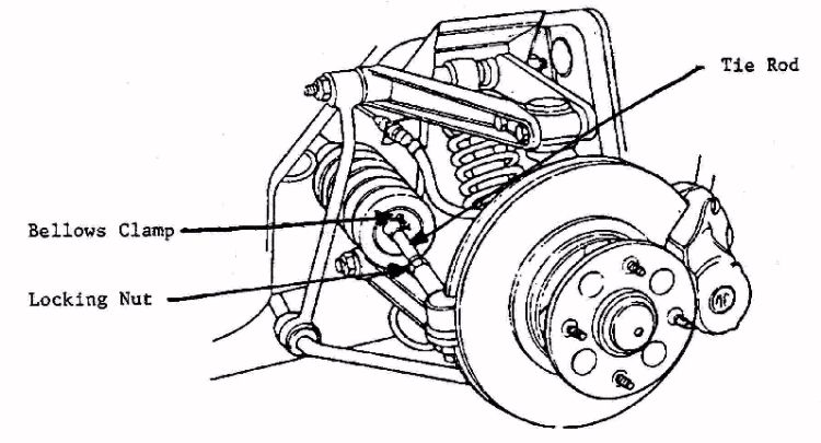 To adjust the front wheels locate the end of the steering linkages. Loosen but do not remove the clamp on the bellows and loosen the locking nut (shown below). Repeat this on the other side of the vehicle. Rotate BOTH tie rods (the ends of the steering linkages) the same amount. This is done by hand or gently with grips (pliers etc.). Now move the vehicle forward and backwards a couple of times so that the wheels turn 1 revolution and the tires move to the new position. Recheck the toe-in. If not correct readjust as necessary. When you have two readings that are correct (IMPORTANT: MOVE VEHICLE IN A STRAIGHT LINE BEFORE MEASURING TOE-IN EACH TIME) tighten the locknuts carefully so as not to move the tie rods and retighten the bellows clamp. Now take one final check of the toe-in (YOU MUST CHECK AND ZERO THE GAUGE EACH TIME). You have done a better than professional job.