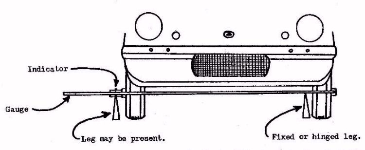 Gauge is shown in front of the front wheels, clearance will be less towards the center of the car and it may be necessary to remove the legs to lower the gauge. It is important that the gauge be at the same height in front and behind the axel, so use the same modified legs for ALL READINGS.