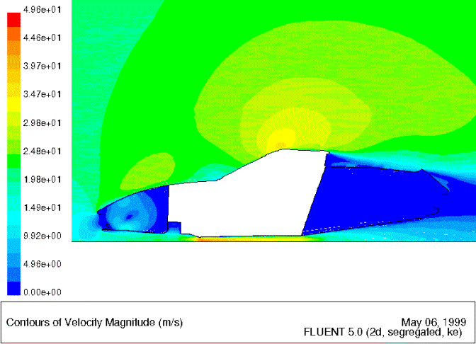 velocities under the car are much high, suggesting lower pressures and a bit of