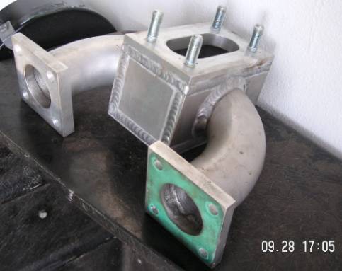 Back to the story.. After pondering at work about a possible carb swap on the Lotus, I went home that evening and started measuring the available space around the intake side of the engine in the Lotus. I also removed the Strombergs and measured their mounting pattern, mounting angle, etc. I then went online and searched the dimensions of the DGV, including the carb’s base mounting pattern. At work the next day (You probably noticed here that I occasionally get a little free time at work) I fired up AutoCAD and started drawing. I played with designs on and off for about two weeks, until I finally came up with a crude design that I felt would be a good prototype. At this point, I sent the design off to Krem Engineering and had Al make me up one out of scrap aluminum. This is basically what I got back (Picture was taken after it had been mocked up and tested, so it’s a little dirty).