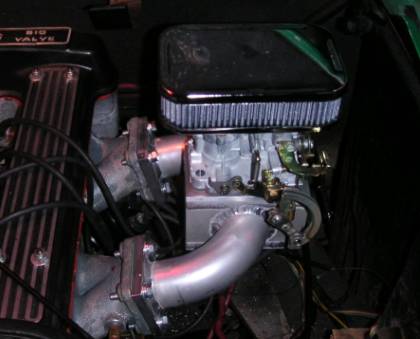 Below is a picture of the finished assembly. The original design had the throttle cable coming across the engine which proved bad as it melted the throttle cable. After fruitlessly trying to insulate the throttle cable, I realized it was possible to rotate the carb on the manifold 180 degrees, and run the throttle cable under the car away from the heat. This also placed the choke actuation in perfect position for the stock choke cable.