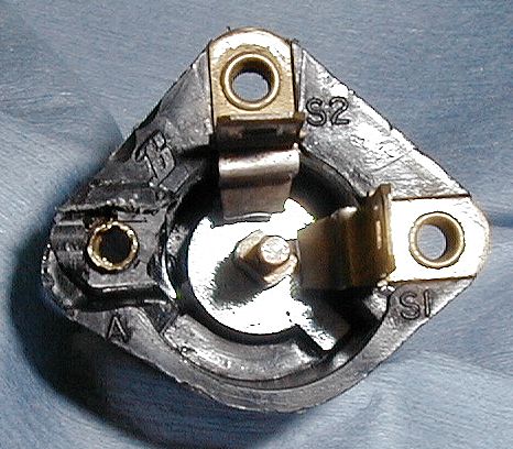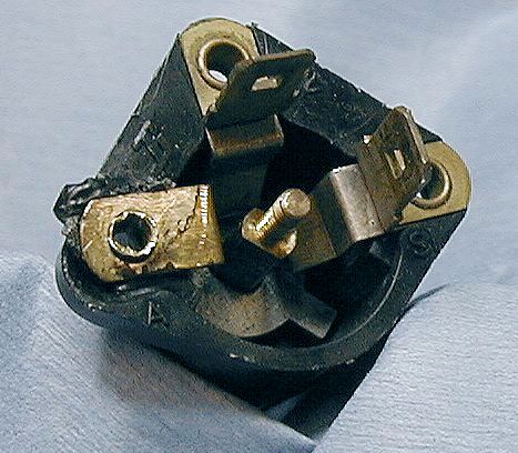 The image in Figure 2 is a view of the switch with the center wiper barrel removed. Notice that the structure for the left contact is displaced from its correct position. This probably happened due to excessive heat that resulted from poor contact inside the switch. The result of this displacement was that the no contact was made between the wiper and the rotating piece.