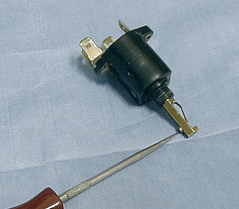 To remove the switch assembly from the car, depress the shaft pin with a pointed instruement through the hole on the side of the knob and pull the knob off the shaft. Unscrew the chrome ferrule and push the switch out of its mounting hole. Note or label the wiring assignemnts to the switch (3 wires). Remove the wires from the switch lugs. Figure 1 shows how the pin part works.