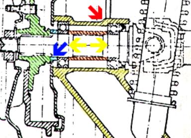 Bearing spacer – Assemble the bearings in the hub carrier. Be sure the cups are pressed in solidly and fully seated. Measure the distance between the bearing cones and make a new spacer this length, plus 2 or 3 thousandths of an inch to allow end float. (Orange section, yellow arrows)