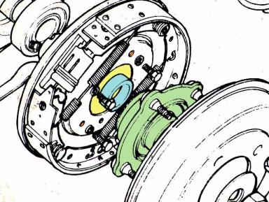 fit into the open center of the brake backing plate (Yellow opening). Bend small metal tabs to fit under the outer