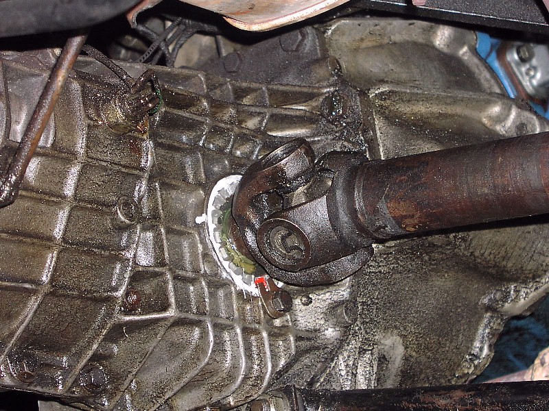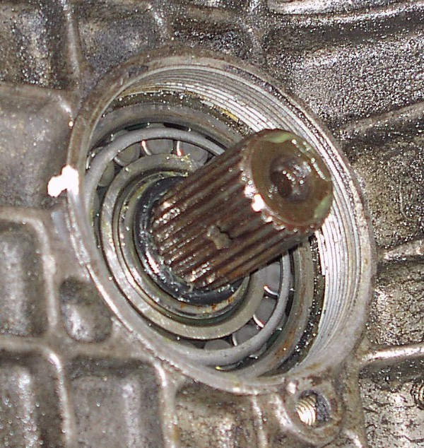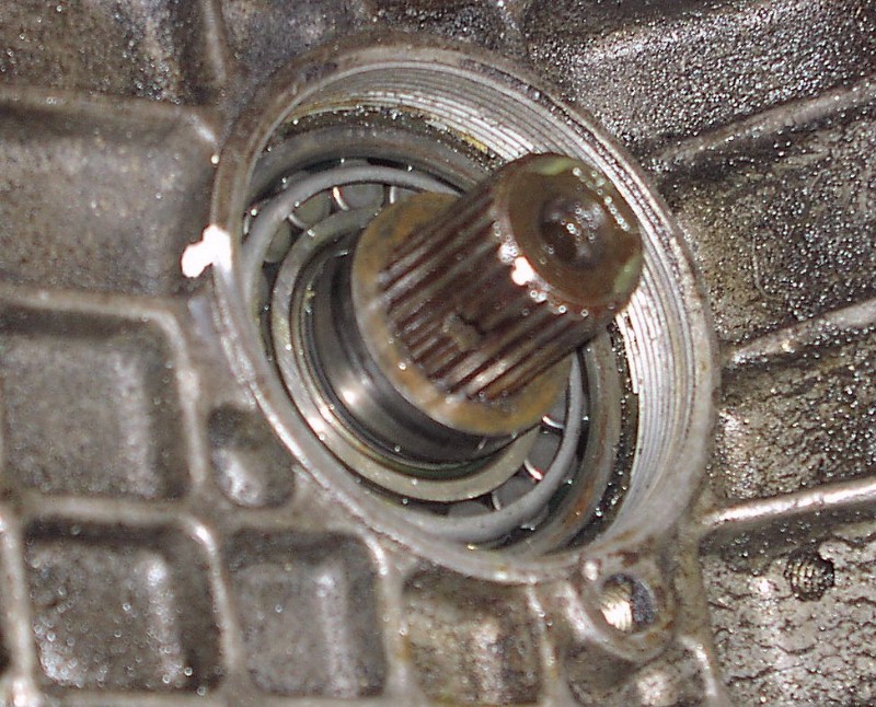View with the nut and seal removed. The big diameter ring on the shaft below is the seal land. The o-ring is hidden behind it. You can’t twist it off because it is splined to the output shaft. I pried it off with two medium size screwdrivers 180 degrees apart.