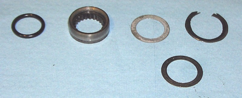 Left to right. The o-ring, the seal land, shims. The seal land is shown with the inboard side facing up. Note the big chamfer on the ID. This provides space for the o-ring. There is no chamfer on the outboard side (see picture 1), so care must be taken to put it in the right way. My car had no shims on the right side and two on the left. They were stuck onto the seal land. Since the thin one was broken, I got one the same thickness as the other two combined to replace them with