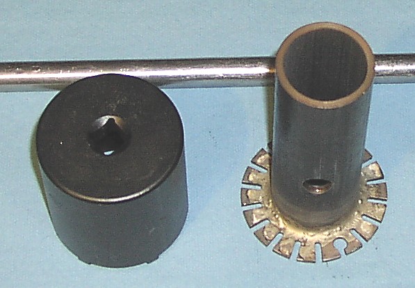 The special tools I used. The tool in back is to tap out the drive shaft roll pins. I made it from a ratchet extension bar. The other two were for getting off the nut. Left front is Performance Tool W1270 (13 bucks at local auto part store). Front right is home made tool borrowed from George. I had a hard time using the 18-slot tool because it kept popping off. If I had an assistant to hold it in position I think it would have worked well. I managed to get the nuts off using the W1270 tool, Kroil, and heat from the mapp gas torch.