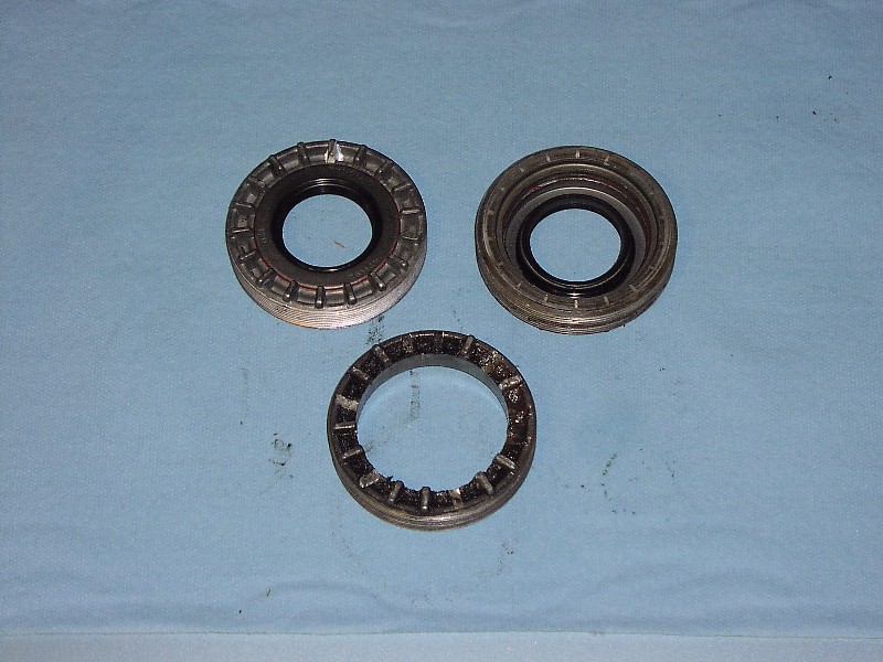 The nuts with the new seals installed. Top left shows the outboard side, top right shows the inboard side. The bottom nut is the old one with eight tabs broken off and the seal removed.