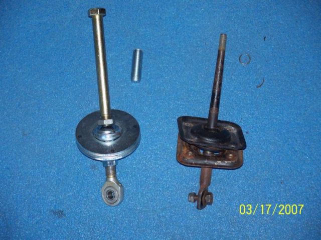I have a ball joint cut from a heim joint welded to a BIG washer (3", 1" hole) as a shift pivot and a ball bearing rod end at the tube clevis. Since the shifter lever (half inch bolt) theads into a coupling at this rod end, I can adjust the amount of lever throw. This is accomplished by loosening the lever and screwing the coupler up or down the ball bearing rod end. The result is either increasing or decreasing the distance between the ball joint pivot and the center line of the rod end bolt at the tube clevis.