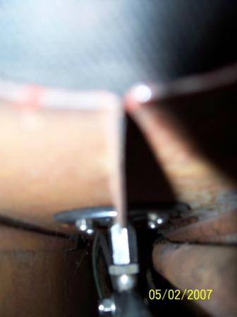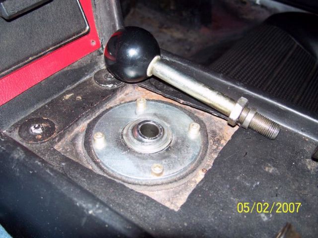 Four bolts (original bolts if you like) hold the BIG washer and ball joint to the Frame and another BIG washer inside the frame; four mounting holes drilled in each washer. These two washers and some homemade rubber disks sandwich the frame tunnel. The large rubber disks isolate the BIG washers from direct contact with the frame to help vibration dampening and noise (ha, ha). I know what you are thinking...and yes the bolt shift has a shifter knob on the end so one cannot tell it is actually a bolt.