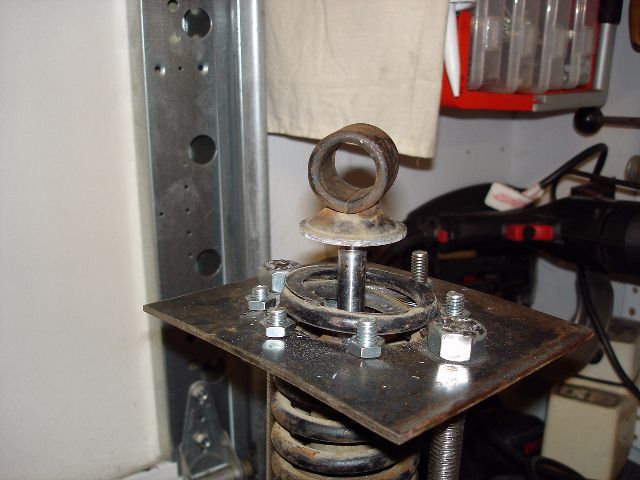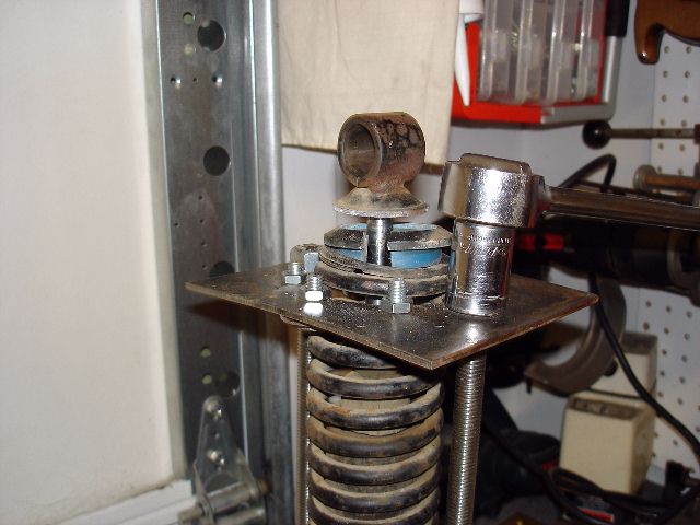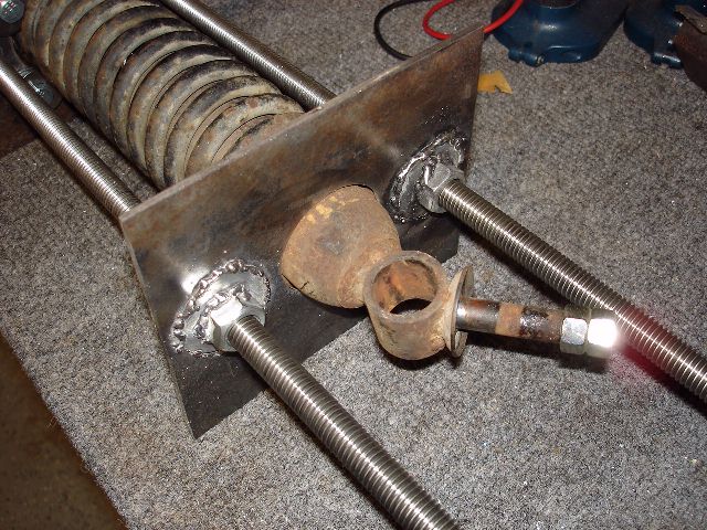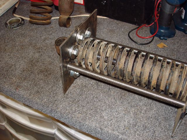 I used scrap 1/8" thick steel and a 36" long 1/2" threaded rod (Home Depot), cut in half to construct the compressor. The bolts around the inside periphery of the top plate are 3/16" and the washers were found in my junk box. The crappy welding job is due to my hurry to complete the compressor and my old-age eyesight (My glasses don't work well inside the welding helmet). While it doesn't look pretty, it works very well.