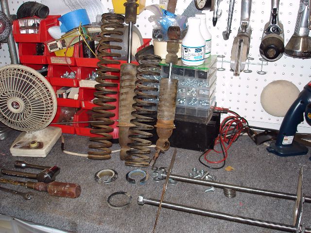 S1A - Built a spring compressor and removed the spring from one front and one rear damper. The dampers appear to be in good condition, offering excellent resistance to both compression and expansion, and exibiting no leaks. I plan to clean, paint and reuse them. If they prove to be unsatisfactory, I can always replace them later.