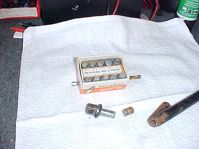 Drilled the broken stud in the left seatbelt brace and removed it with an extractor.
