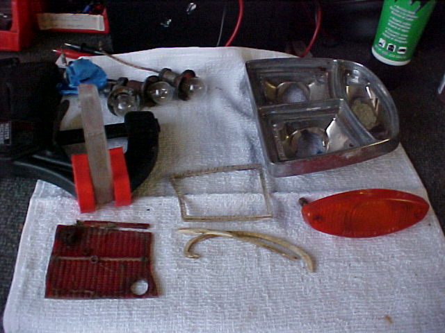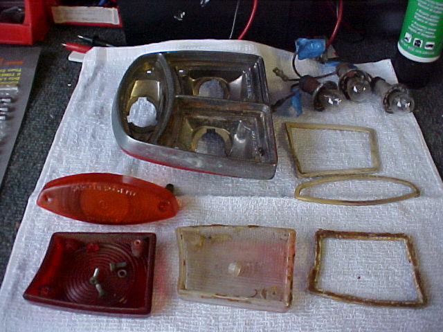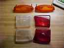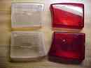 - Disassembled the left and right taillights. The left one has one broken mounting boss on both the red and white lenses. The right one has a red lens that the PO made from a flat piece of an old lens from some other car and the white lens has one broken mounting boss which I glued together and clamped.