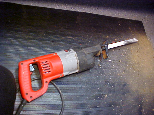 S1A - Got out my trusty Sawzall and a new 9" metal cutting bade and removed the right (passenger) door. Cut the door hinge pin at the top and bottom while supporting the latch end with a large box I had on hand.