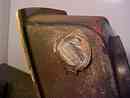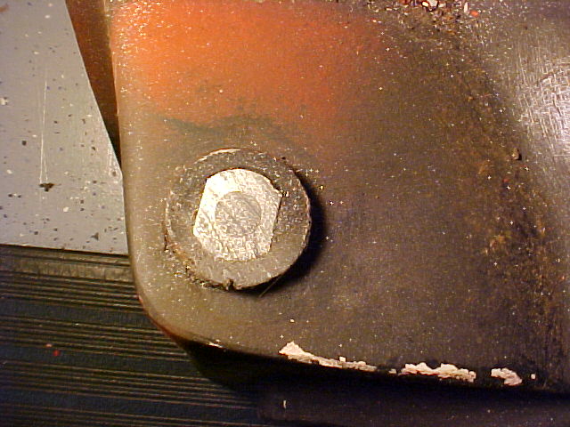 To remove the remaining pin from the door it was necessary to unscrew the nut on the bottom bushing and drive the pin and bushing out the bottom of the door. The top bushing nut was frozen so I ground the outside shoulder off and tapped it out to the inside of the door.