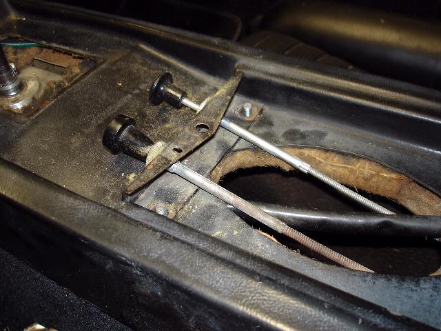 - Two nuts holding the choke and heater pull knob bracket (hold a 7/16" wrench on the bolt head in the tunnel).