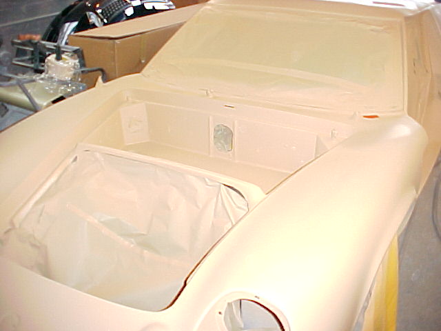 Today the body shop sprayed primer on the boot cover the engine cover and the outside of the doors. They keep finding small spots that need filled when they sand the primer. It looks like they have found almost all of the spots now and the car should go to paint very soon.